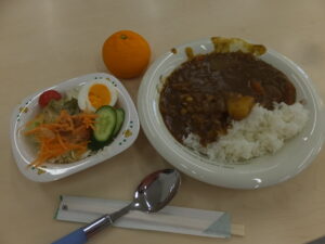 まずはおいしい手作りカレー(差し入れのミカン付き)
