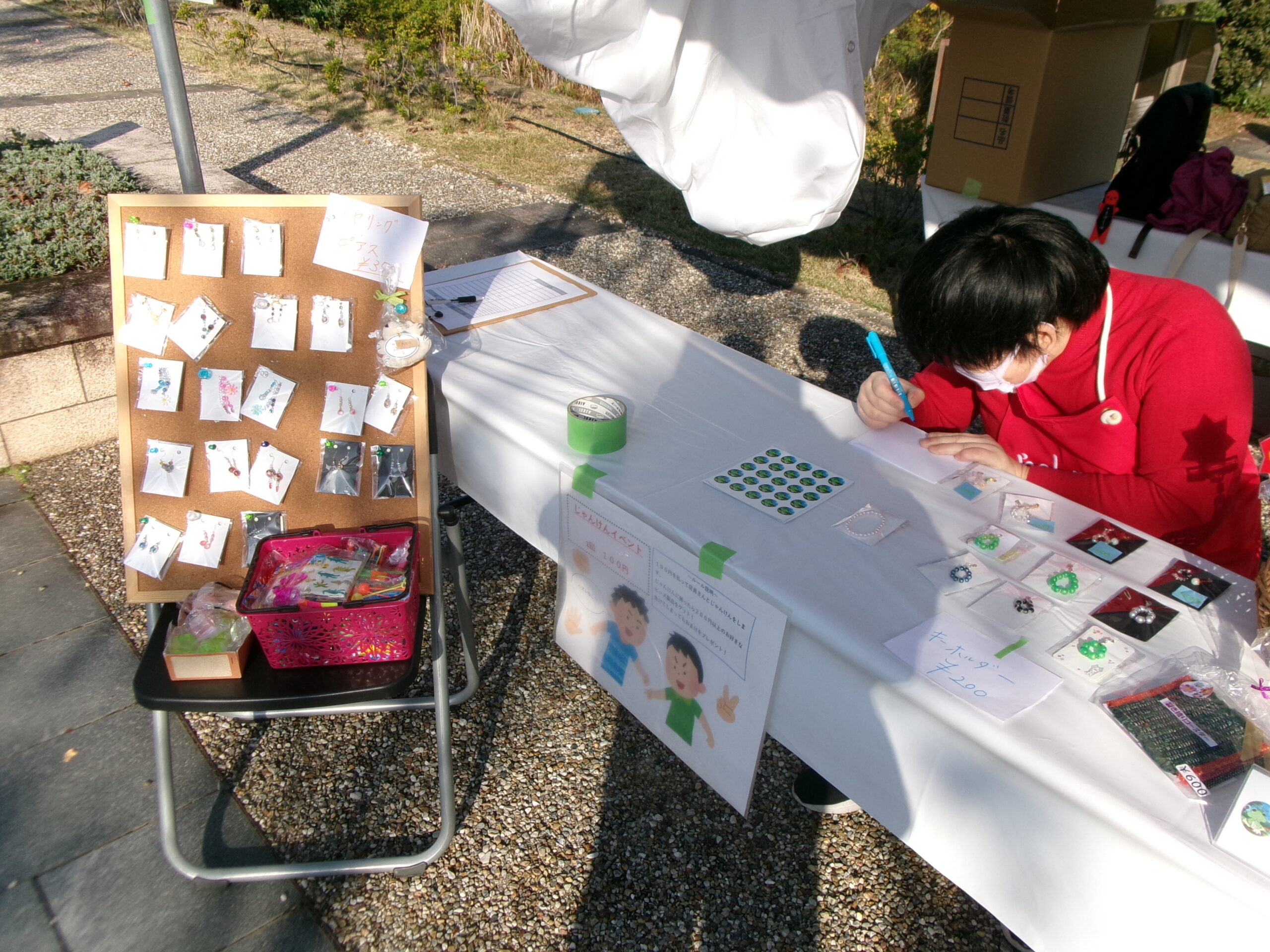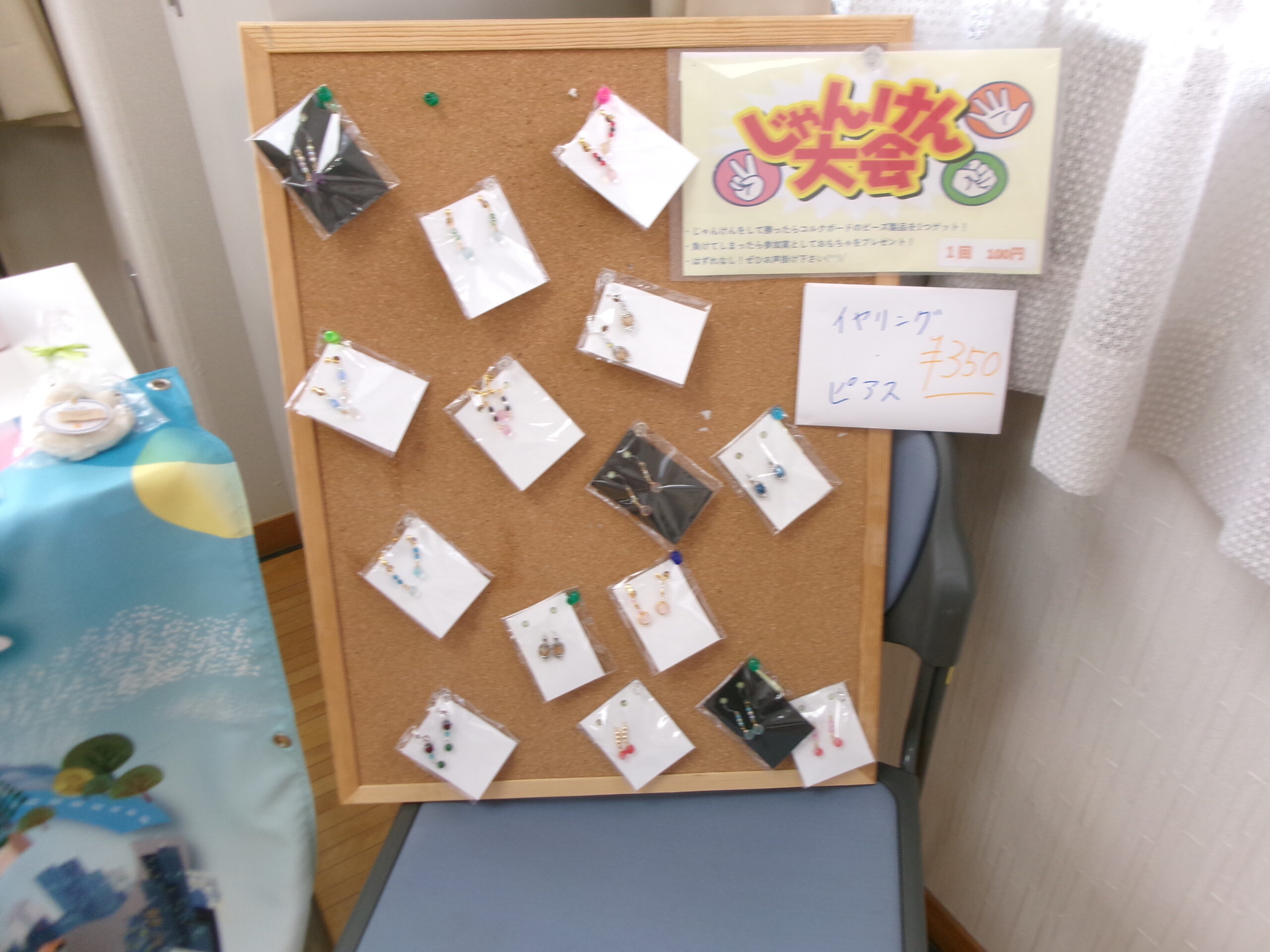 1回100円のじゃんけんに勝ったら350円相当のビーズ製品を、負けてしまったらおもちゃと交換というルールです。