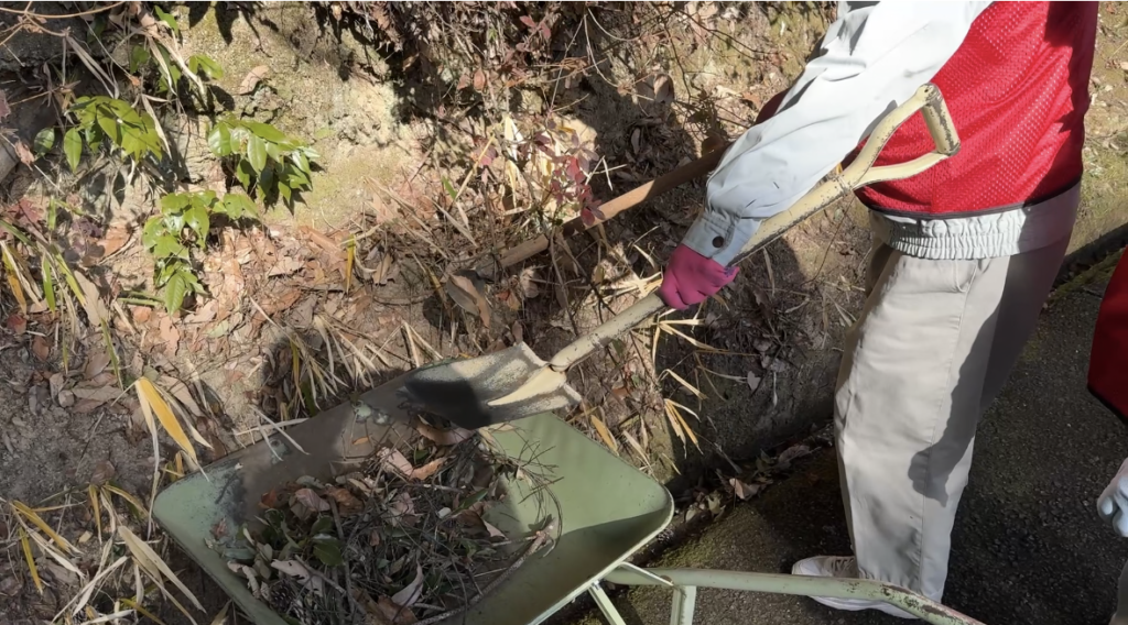 今日の作業は、溝の落葉や小枝を取り除き、回収することです。