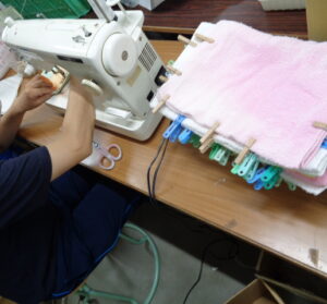 軽快なミシンの音が聞こえてきたこちらでは、Kさんが雑巾を作っています。